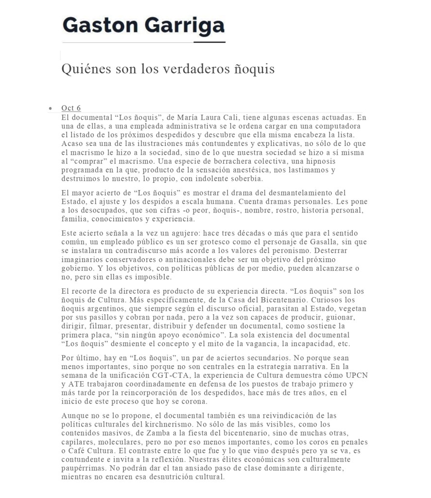 - Sorpresa y emociones varias… Los Ñoquis, espejo esperpéntico de estos años macabros de neoliberalismo… pero sí, hay que mostrar lo que nos pasó, nos pasa, hay que seguir… buenísimo trabajo colectivo. (Daniel Mancuso)